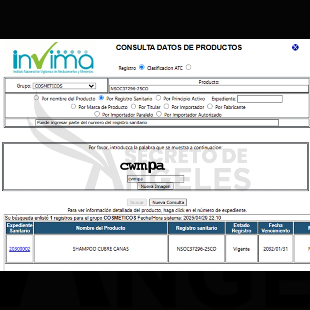El Shampoo Cubrecanas Secreto de Ángeles cuenta con registro sanitario INVIMA, lo que garantiza que cumple con todos los requisitos legales y de calidad exigidos por las autoridades de salud en Colombia.